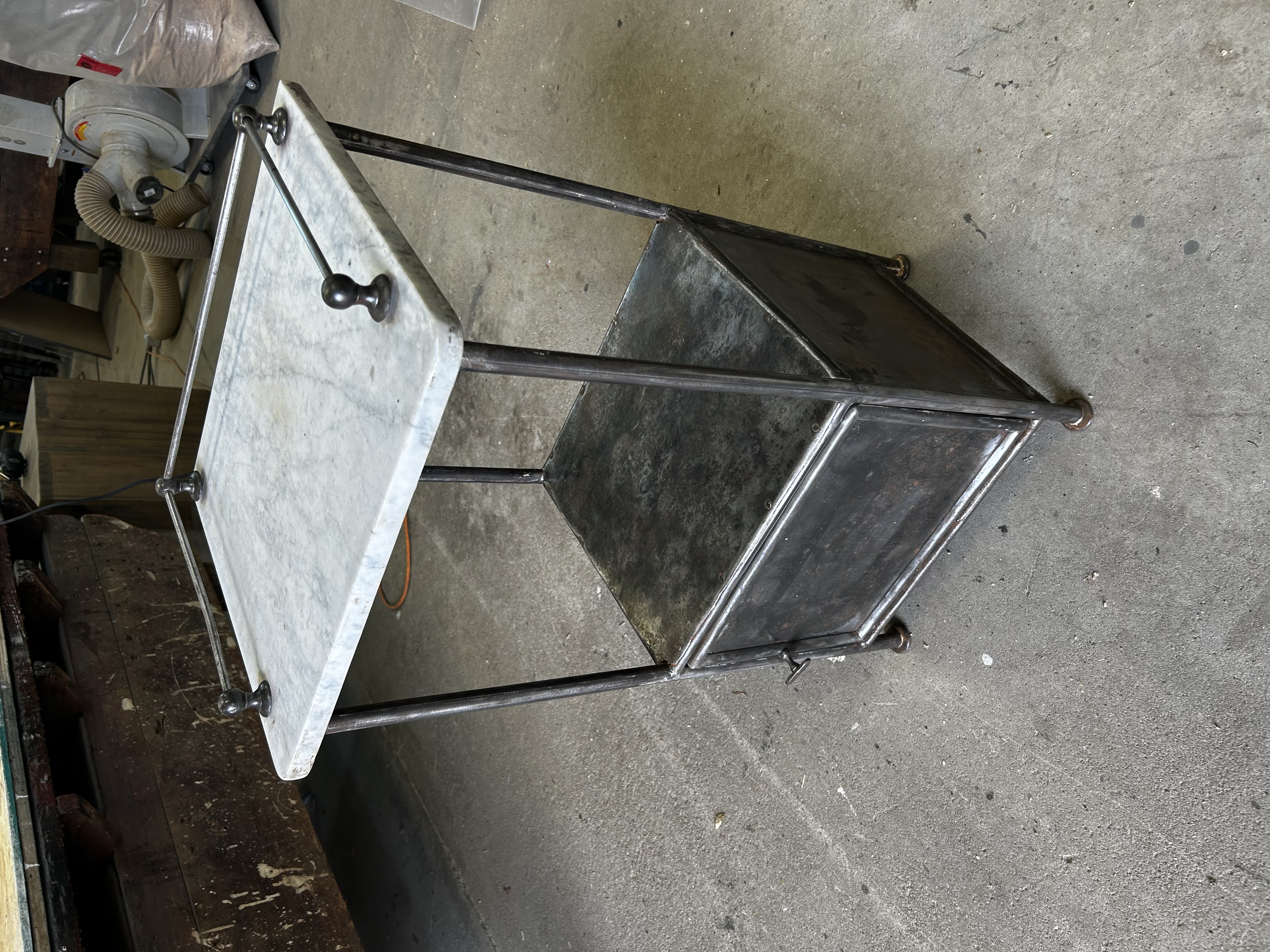 Crafted from raw steel and topped with honed Carrara marble, this compact side table recalls the utilitarian grace of early 20 th-century medical carts. The elevated gallery rail detailing and boxy lower compartement give it a grounded, purposeful presence.